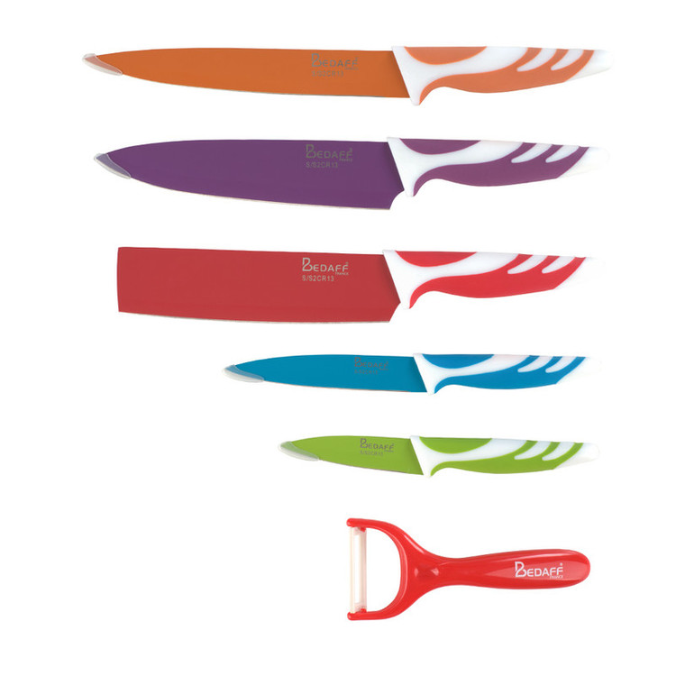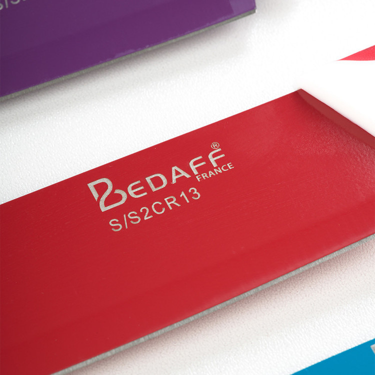 محصولات کاربردی آشپزخانه، مدل Bedaff، با اصالت فرانسوی، کاربردی و باکیفیت بوده و بعنوان کالاهای اقتصادی، جهت استفاده روزمره قابل استفاده است. این سرویس 6 عددی شامل 5 چاقوی کاربردی و 1 عدد پوست گیر در طیف گستردهای از کارهای روزمره، از پوست کندن و برش دادن سبزیجات گرفته تا بریدن گوشت یا نان، عالی عمل میکنند. تیغه تیز چاقوها از جنس فولاد ضدزنگ S2Cr13 ساخته شده است که در برابر خوردگی مقاوم است، تیز بودن طولانی مدت تیغه، تضمینی بوده و نگهداری آن آسان است . تیغه پوست گیر از جنس سرامیک و کاملا برنده و قابل اطمینان می باشد. به عبارت دیگر، این ست کاربردی ، یک دستیار عالی برای هر آشپزی محسوب میشود. ویژگیهای محصول: متریال مرغوب اتصالی در دسته چاقو ها (ترکیب سیلیکون و ABS) | تیغه تیز و با کیفیت با حفظ قدرت برش در طی زمان | طراحی ارگونومیک جهت جلوگیری از خطر سرش در اعمال فشار ابعاد محصول: پوستگیر 15×6 | چاقو آشپزخانه (بنفش) : ابعاد 31 سانتیمتر | طول تیغه 18 سانتیمتر | چاقو برش گوشت (نارنجی) : ابعاد 32 سانتیمتر| طول تیغه 19 سانتیمتر | چاقو ساطوری (قرمز) : ابعاد 29 سانتیمتر | طول تیغه 16 سانتیمتر | چاقو چند منظوره (آبی) : ابعاد 23 سانتیمتر | طول تیغه 12 سانتیمتر | چاقو میوه خوری (سبز) : ابعاد 19 سانتیمتر | طول تیغه 8 سانتیمتر ابعاد بسته بندی: 36x23x3 سانتیمتر
