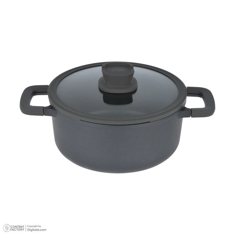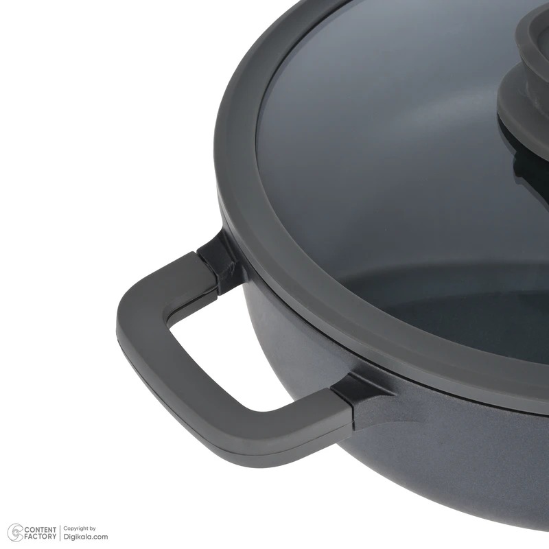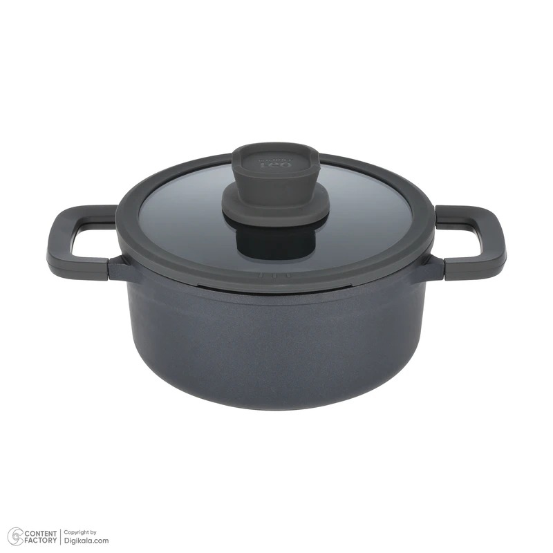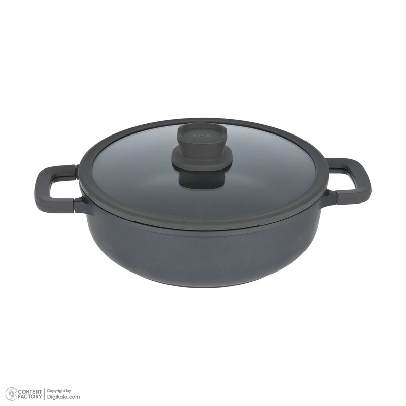 سرویس 10 پارچه مدل لئو استون مشکی دارای 2 سایز قابلمه و 2 تابه تک دسته بدون درب و یک تابه ی 28 دو دسته عمیق درب دار و یک شیرجوش 18 سانتی متری میباشد
